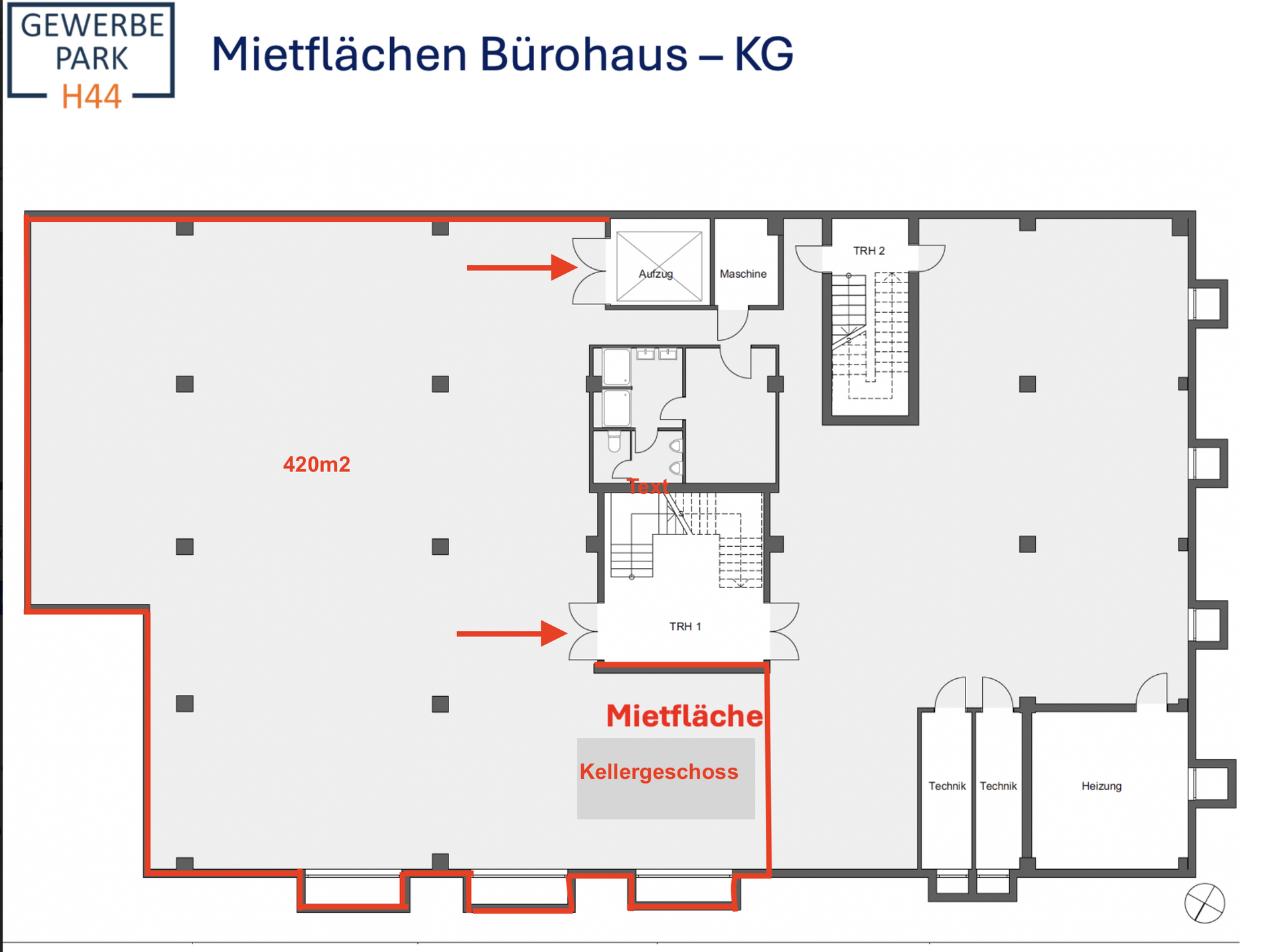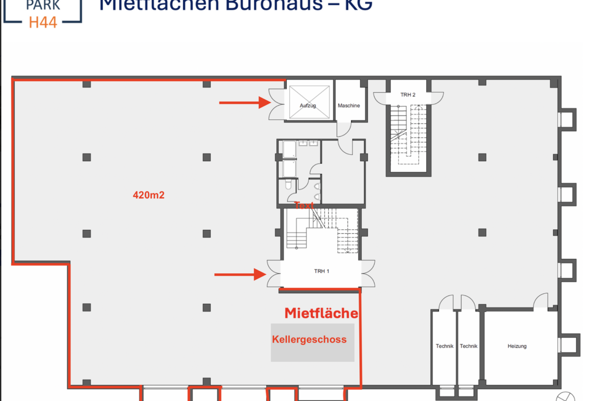 Die Fläche beträgt ca. 420m², mit einer Deckenhöhe von 3,80m und ist über eine Treppe sowie bequem über einen Lastenaufzug erreichbar – auch für den täglichen Betrieb.