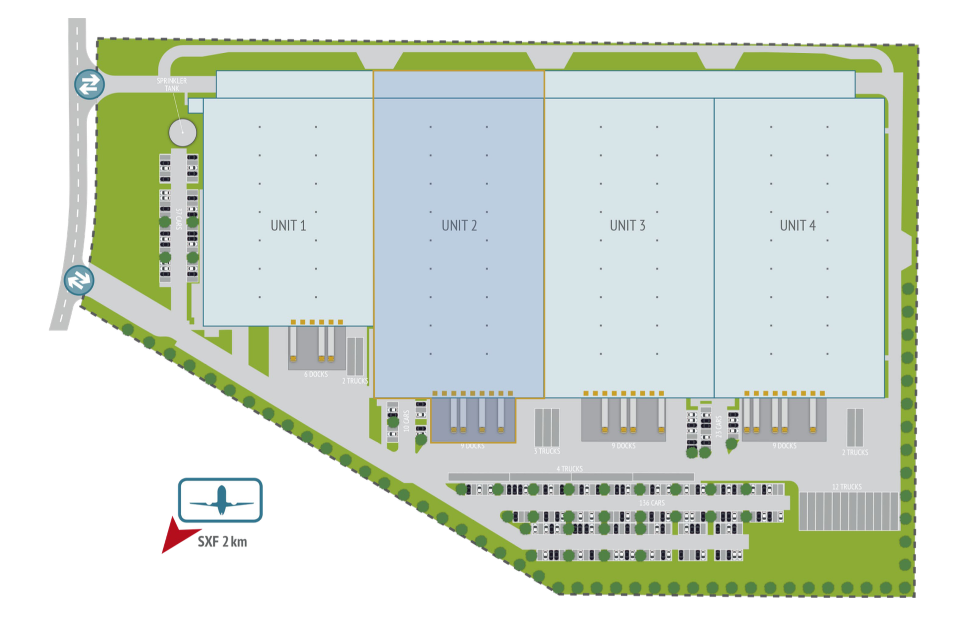 Ladetunnel: pro Unit drei ebenerdige Tore zur seitlichen Be-/Entladung (12 insg.)